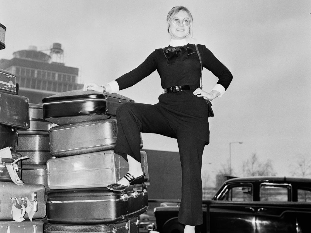 For this photoshoot, which took place at Heathrow Airport, Mirren wore an outfit that would look just as stylish today. Her round glasses are very reminiscent of the ’60s and the era’s burgeoning hippie fashion trends, but her blouse and pants matched with her chic heels make the ensemble lean towards business casual.