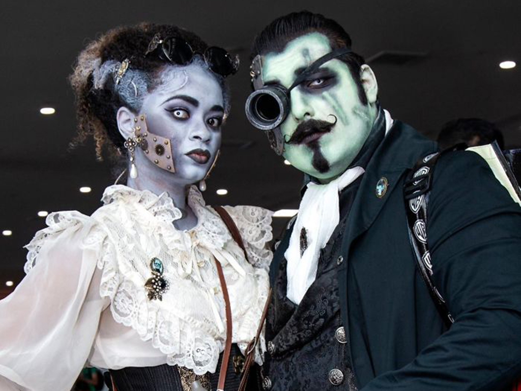 These costumes are perfect examples of using makeup to perfect your cosplay. The gorgeous hues of their skin and the steampunk details of their accessories make these outfits stand out from everyone else at the convention. It looks like both of them really found someone to stay with ’til death do them part.