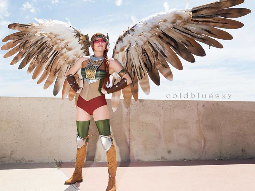 Hawkgirl, a lesser known superhero from DC Comics has been featured in comics since 1940. And this cosplay seems to take inspiration from some of her earlier comic appearances with red hair, green tights and huge hawk-like wingspan.