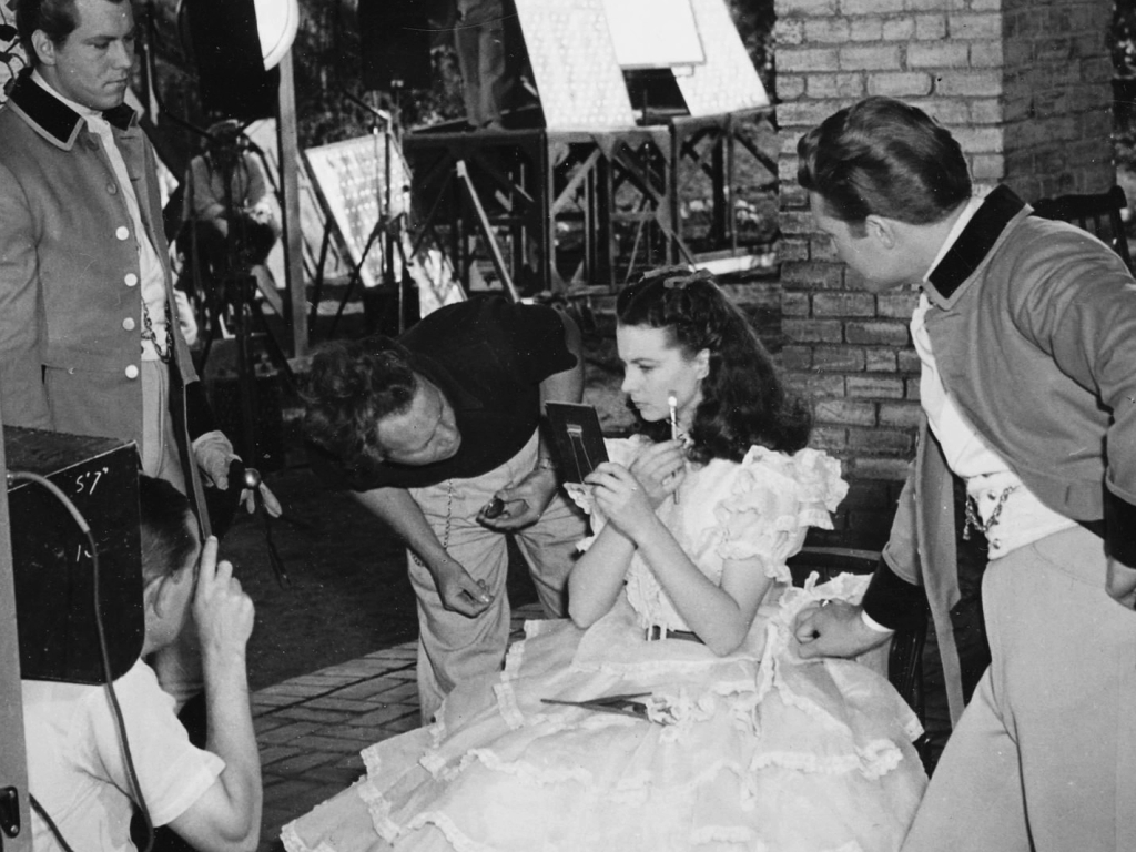Here in this behind the scenes photo from the filming of Gone With the Wind, Vivien Leigh can be seen adjusting her own makeup, ready to play Scarlett O’Hara. Meanwhile, her fellow cast and crew stand around, watching awkwardly.