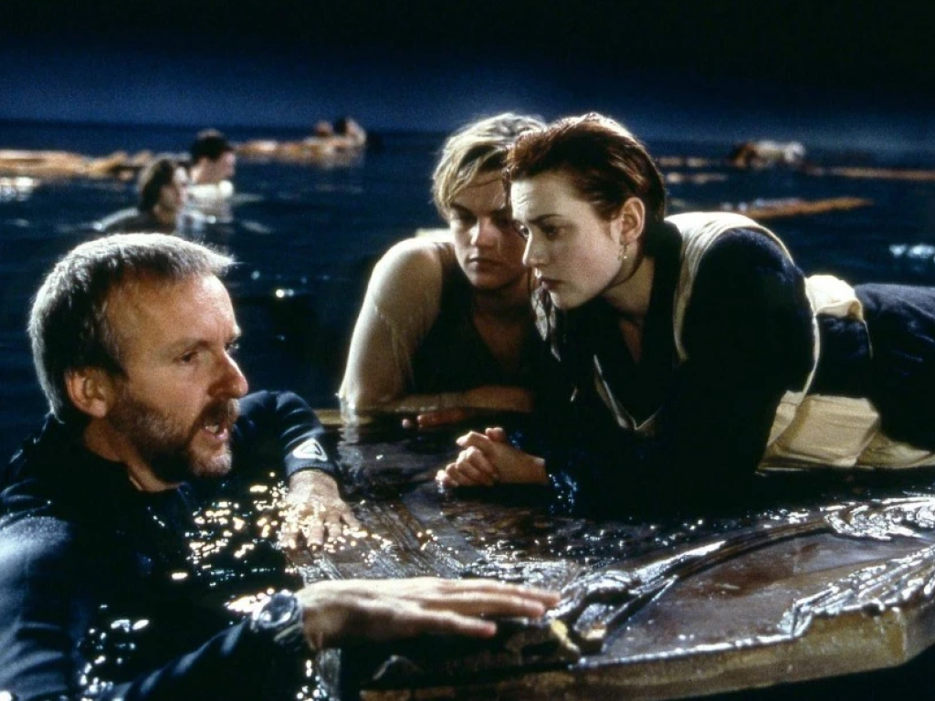 The climactic scene between Jack and Rose at the end of Titanic was clearly not easy to film. Here, stars Leonardo DiCaprio and Kate Winslet are being coached by director James Cameron, in a large pool that doubles for the Atlantic ocean in the finished movie.