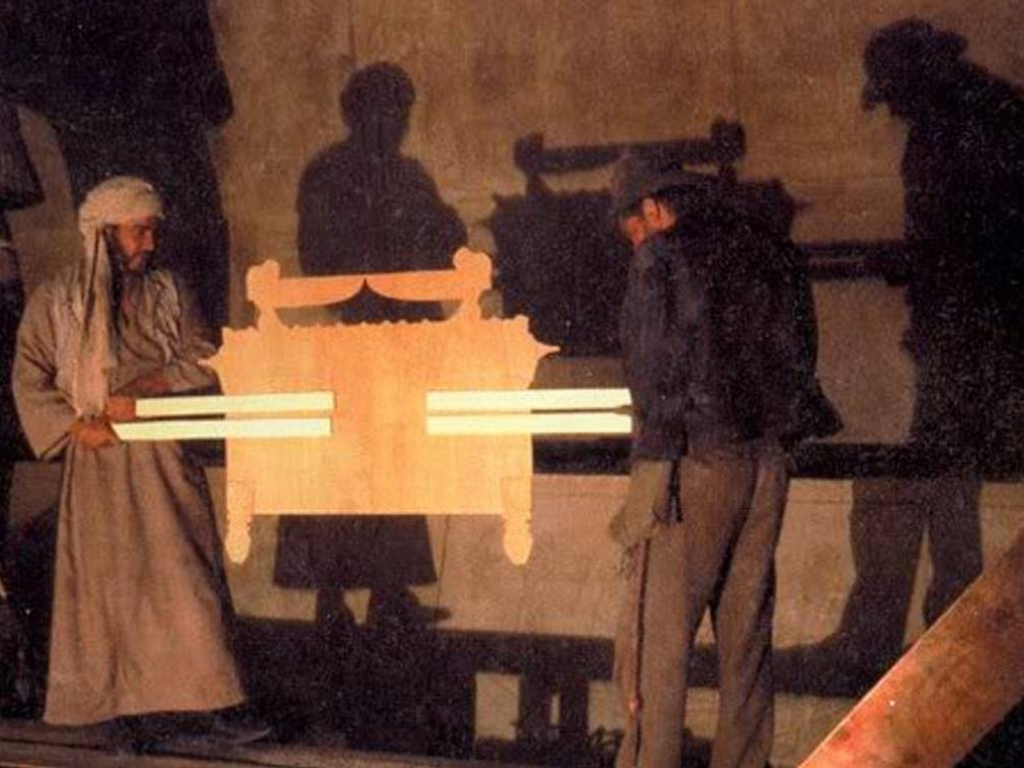 At a key moment in Raiders of the Lost Ark, Indiana Jones is shown in sillouette as he lifts the Ark of the Covenant against an ancient wall. As this behind the scenes photo shows, the Ark’s clearly defined sillouette was actually created using a flat wooden cut-out.
