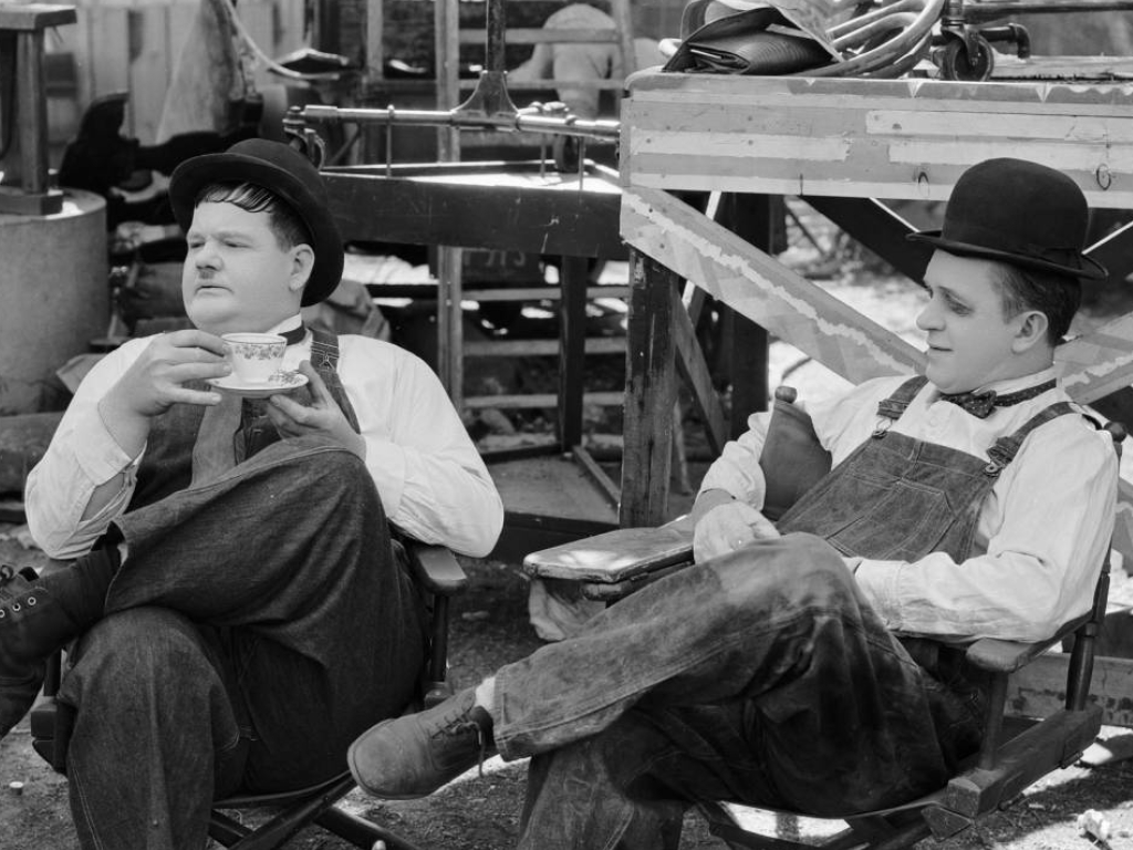 This photo shows legendary comedy actors Stan Laurel and Oliver Hardy relaxing in between filming scenes for their short film Towed in a Hole. This movie would later be remade by the Three Stooges in 1945.