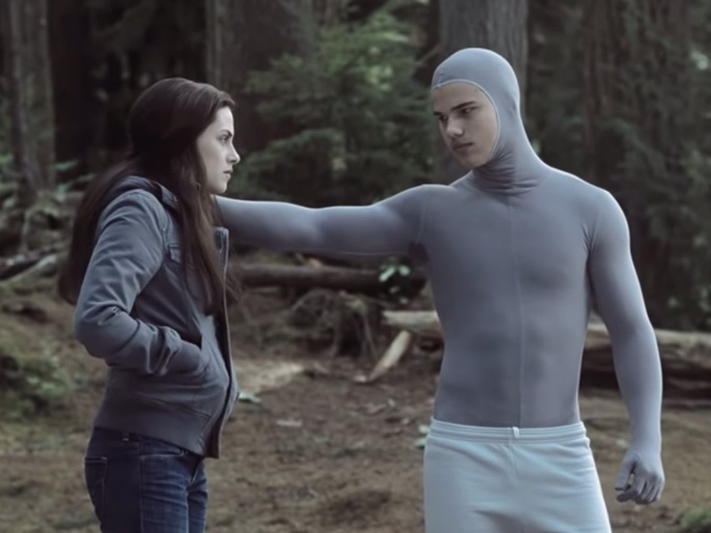 This scene between Kristen Stewart and Taylor Lautner in the teen romance movie The Twilight Saga: Eclipse looks very different in the finished film. Lautner’s werewolf form was created using computer effects, so for his scenes in the movie, he wore a somewhat unflattering morph suit.