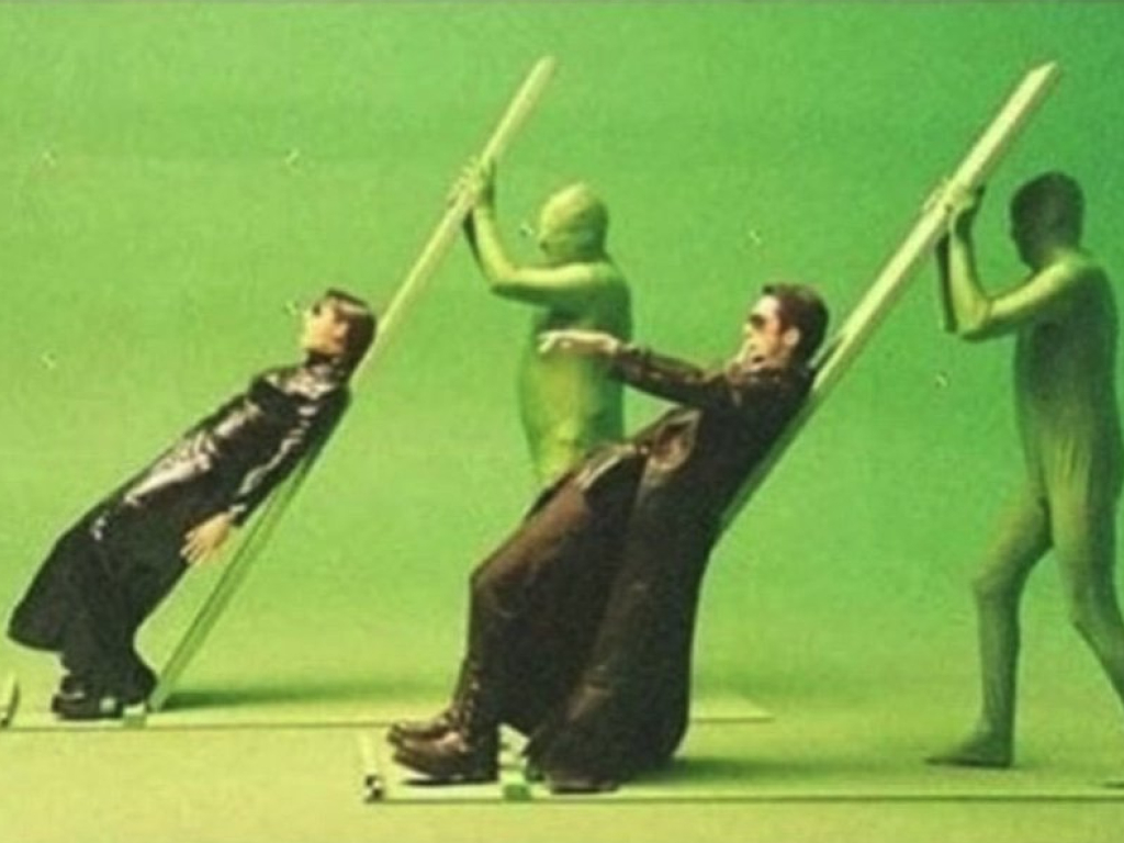 In another green screen photo from the making of The Matrix, Keanu Reeves and Carrie-Anne Moss lean back to avoid a barrage of enemy fire. The scene looks a little less impressive before the green planks of wood and cast members have been digitally removed.