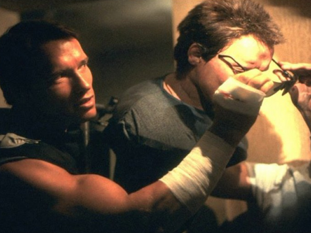 State of the art puppets were used to create the titular character in the sci-fi action movie The Terminator. These puppets were switched out over time as the robot assassin’s flesh slowly peels away. Here, actor Arnold Schwarzenegger is standing behind the puppet in order to take off its sunglasses, revealing its glowing red eyes underneath.