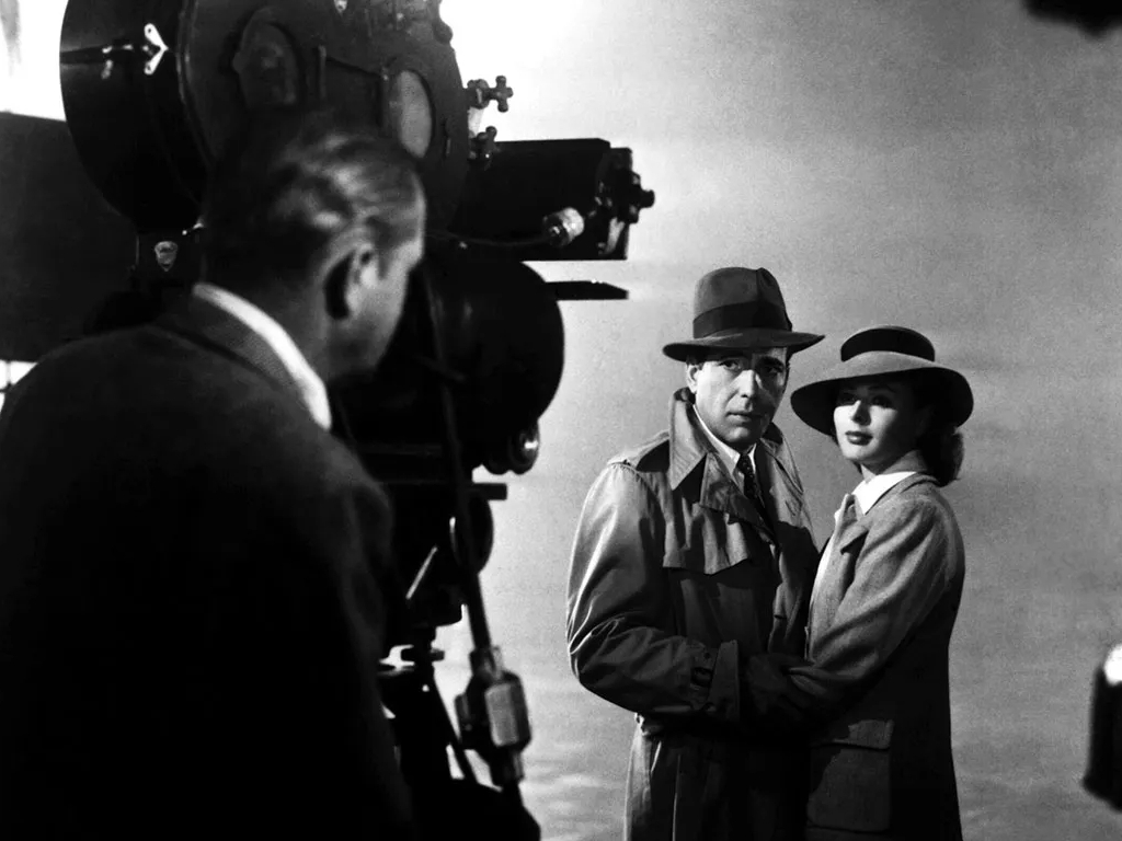 Here, Humphrey Bogart and Ingrid Bergman film one of the most iconic and memorable scenes in all of cinema at the climax of Casablanca. The slightly different angle of this photo not only shows the two stars, but also the camera, recording movie history in the making.