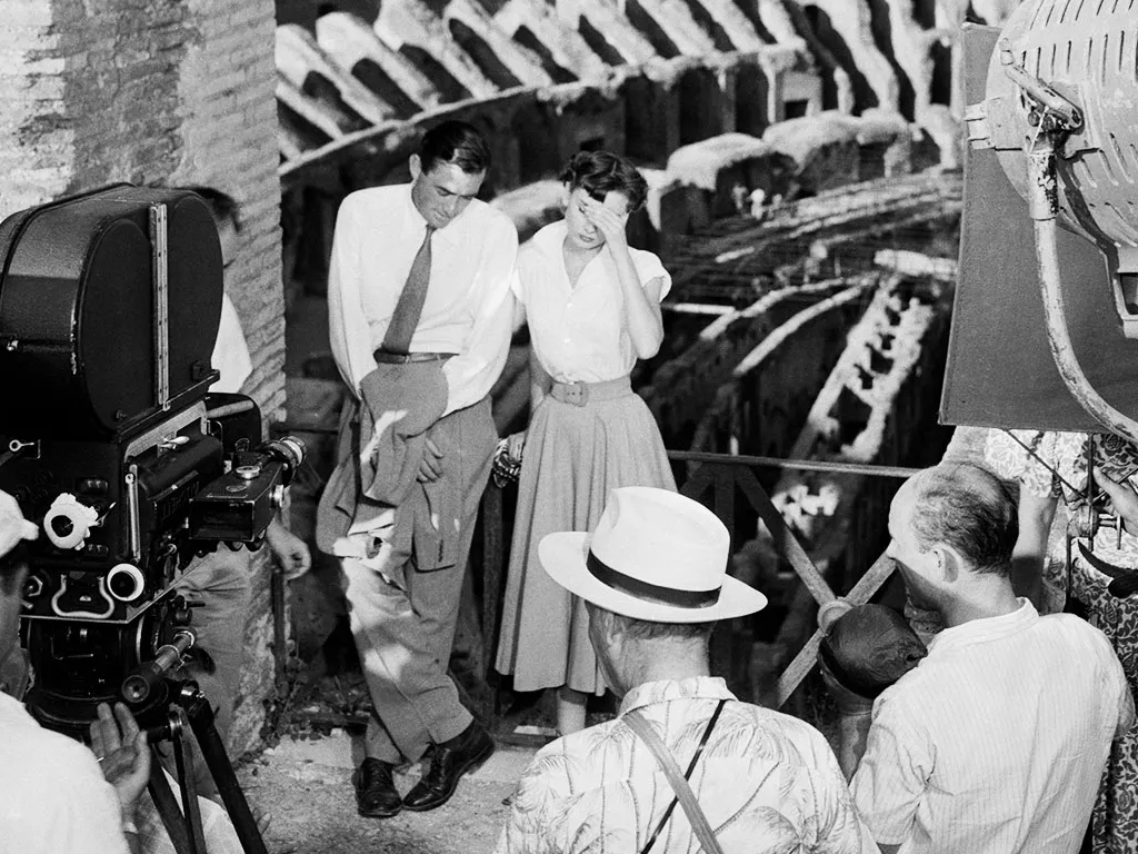 Here, on-location filming for Roman Holiday shows Audrey Hepburn and Gregory Peck enjoying an intimate moment at the Colloseum in Italy. Or, at least, it would be an intimate moment, were it not for all the film crew standing around, just out of the movie camera’s field of view.