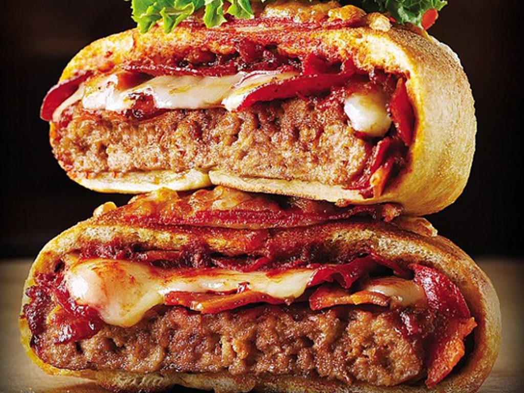 We love pizza. We love burgers. But this one will have you questioning everything. It’s kind of like a Hot Pocket with a burger inside. But burgers weren’t meant to be eaten like that. Do yourself a favor. Eat a pizza slice and then order a burger if this dish is making our arteries cry with fear.