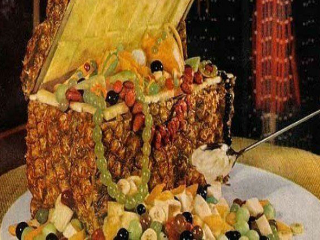 Have you ever seen a fruit salad like this before? It’s even more terrifying once you realize what its main ingredient is. It’s mayonnaise. This vintage party plate graced the pages of a cookbook from when baby boomers were young, and I think I speak for all millennials when I say it can stay there.