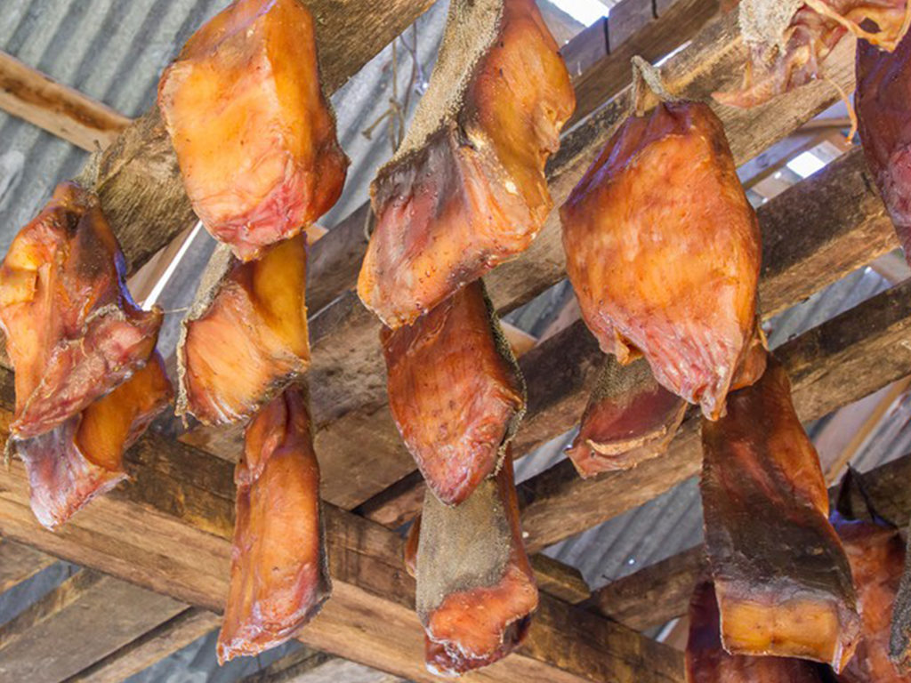 Locals bury the carcass of a basking shark in a pit and press it with stones to drain the poisonous body fluids trapped inside. The meat is left to ferment over several months. Then the meat is hung to dry, cut into strips and served. But brace yourself, because guess what. It turns out fermented shark meat has a really strong fishy flavor.