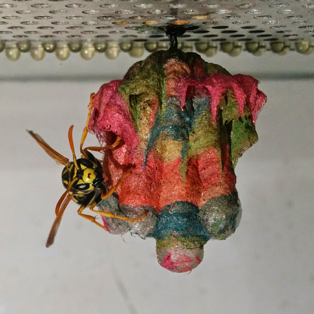 Wasp nests are usually brown and dirt-colored, however, some wasp nests can be multi-colored and even rainbow-colored. This was achieved with the wasps interacting with colored construction paper.