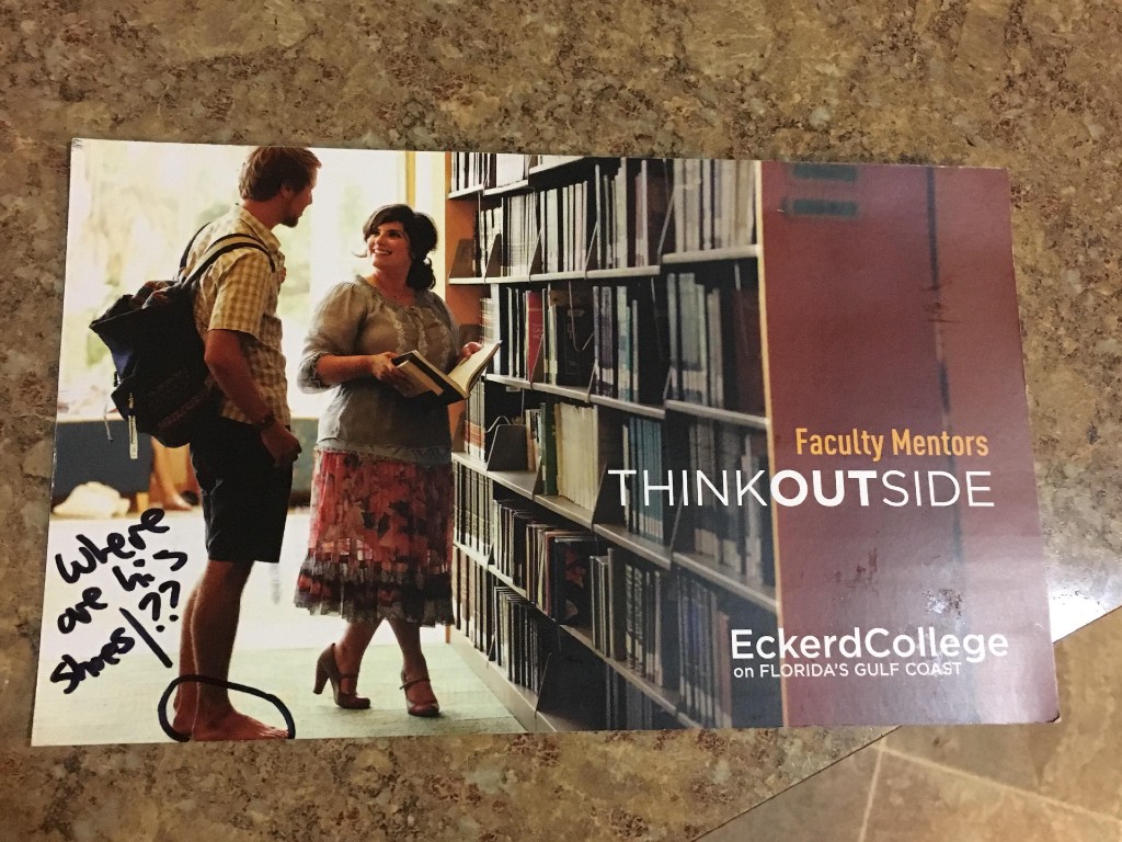The man in this photo didn’t get the memo that you need shoes in the library. In an ad from Eckerd College, a man and woman are having a casual conversation in front of bookshelves. What’s not casual is the man hanging out without shoes in the most sophisticated place in school. While it doesn’t seem to contain weird Photoshop edits, it could still be branded as bad as editors didn’t bother to put shoes on his feet. If they’re trying to show the laid-back culture of the college, they failed as it looks indecent however you look at it.