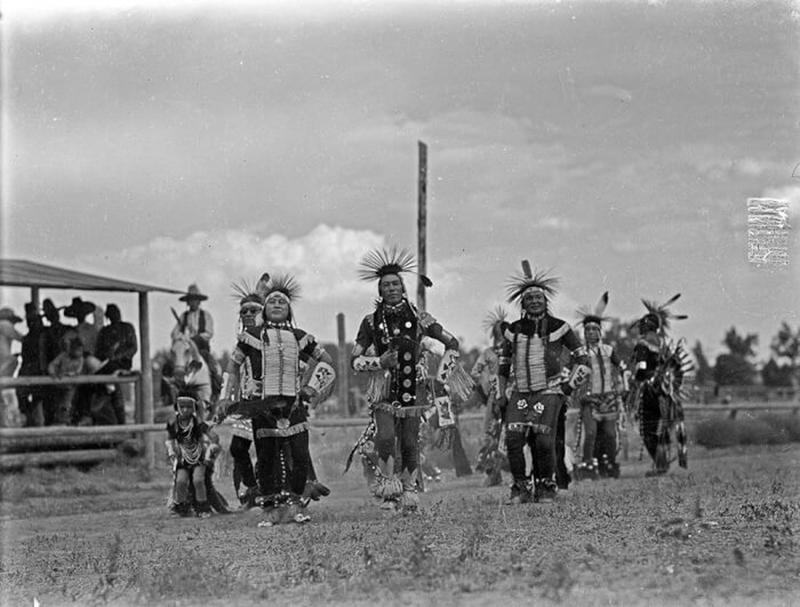 Deux autochtones Oglala Lakota, appelés Elk et Black Elk, faisaient partie de l’exposition Wild West de Buffalo Bill. Ils ont voyagé partout dans le monde avec le spectacle et étaient célèbres pour la danse tout en portant des coquillages et des cloches.