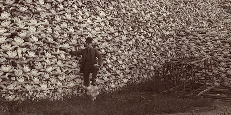 Au 19ème siècle, les bisons étaient tellement chassés uniquement pour leur peau qu’ils étaient presque menacés d’extinction. Cette photo prise en 1882 montre seulement une petite partie des crânes rassemblés, les os restants ont été laissés en décomposition sur le sol.