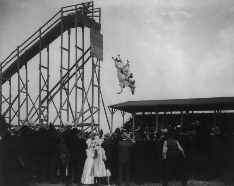 Au début des années 1900 et pendant de nombreuses années, la plongée à cheval était une attraction majeure qui obligeait les chevaux à sauter des tours (parfois avec, parfois sans hommes) dans un bassin d’eau tiède. La photo a été prise en 1905 dans un lieu inconnu, on devine que c’était à Pueblo, dans le Colorado.