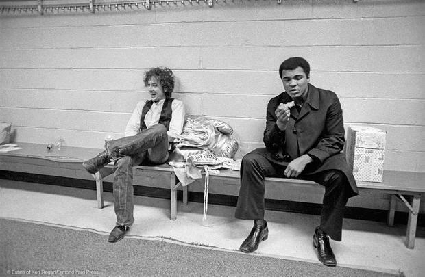 Muhammed Ali avec Bob Dylan dans les coulisses du concert bénéfice de la nuit de l’ouragan, le 8 décembre 1975