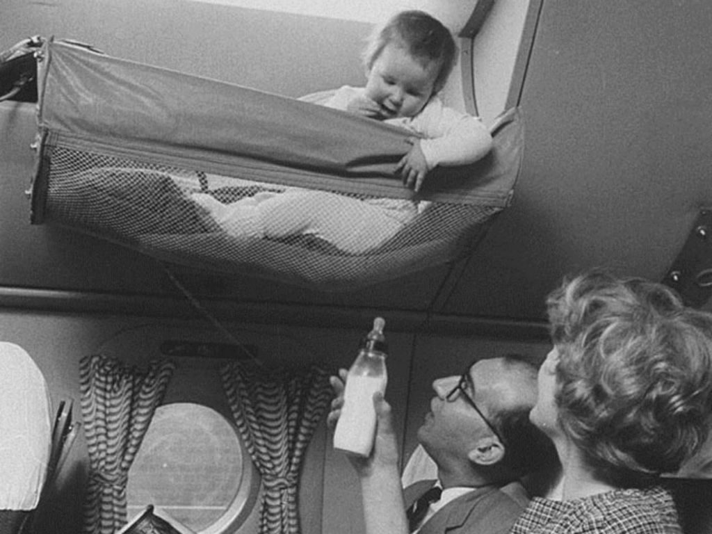 Would you put your baby in one of these today? Years ago, it’s obvious safety concerns were taken for granted with these onboard baby cots. It didn’t seem to cross anyone’s mind that a baby could roll out and land onto the floor or how sudden turbulence could send a baby flying to the ceiling.