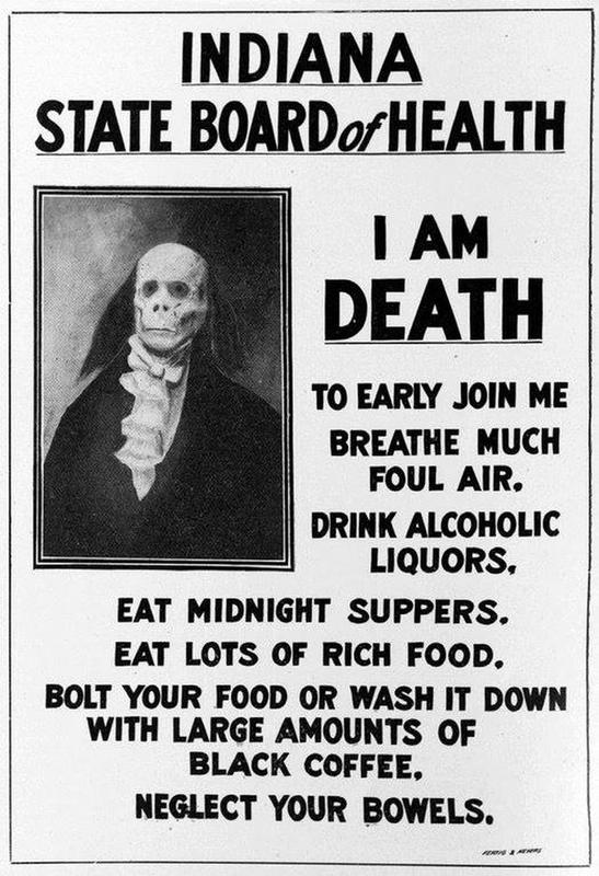A man by the name of Dr. John Hurty, who at the time was the head of the Indiana State Board of Health, was believed to be obsessed with educating the public about all the bad health habits they engaged in. It was rumored that he would go out of his way to show people the right things and how they could make lifestyle changes that would make them live longer- including exhuming a corpse to perform an autopsy, just to show a doctor the right way to do it. This poster was one of the many ways he continued to shock the public. Those who knew him admitted that he had an out-there personality, but that Hurty only wanted the best for people.