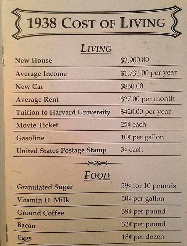 Towards the tail end of the Great Depression, this was what the cost of living looked like in the United States. The prices may look unbelievably low, and they remain that way, even when adjusted for inflation. For example, $420 back in 1938, when these prices were a reality, works out to be $7, 628.27 today. That means that one could’ve attended Harvard for a year for less than $8000, as well as buy a new house that only cost around $71, 000.