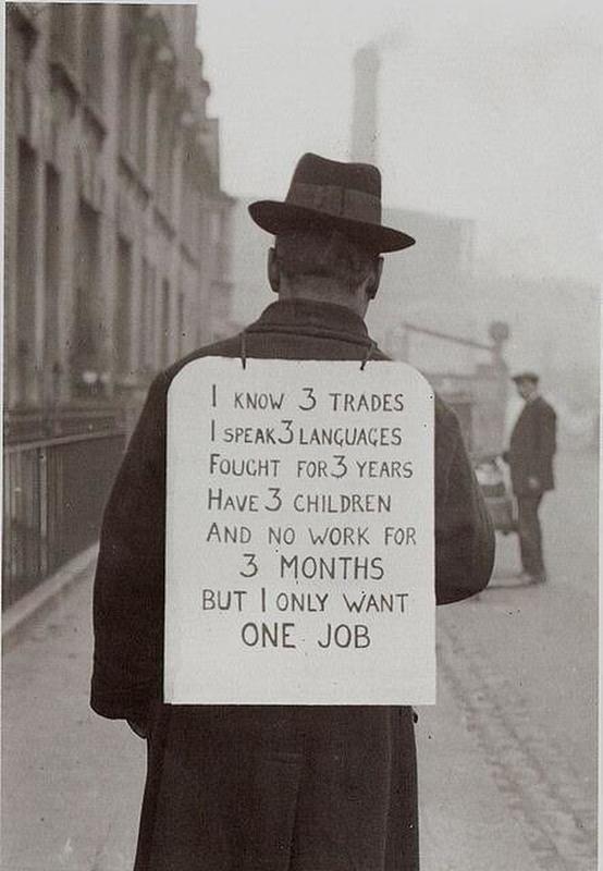 Finding a job without the technology that we have today was very difficult. There was probably no harder time to look for employment in the past than during the Great Depression. Nearly everyone felt the brunt of this economic downturn, which started in 1929 and went on for the next ten years. Even skilled workers, like the one in this image, found it hard to gain employment. It took a disastrous event like World War II to bring the country out of the recession.