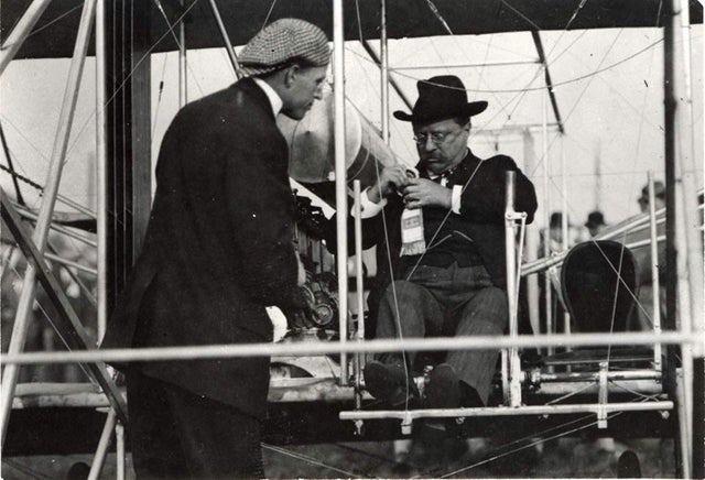 Theodore Roosevelt, the first (and only) president to serve more than two terms, was also the first to take a flight. On October 11th, 1910, Theodore Roosevelt arrived at the Kinloch Air Field and boarded an airplane piloted by Arch Hoxsey. This non-secure, primitive device would never be allowed near another U.S. president in this century. Today, however, presidential air travel is so normal that the leader of the free world has his own hi-tech plane, named Air Force One.