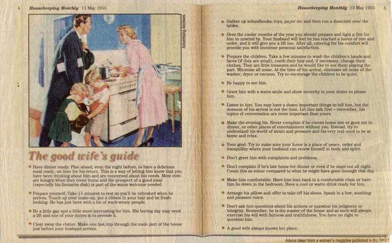 Decades ago, which we’re sure will be a sore point in the history of humanity, it was believed that a woman or wife’s role, was just to make her husband happy. Thankfully, that has changed (for the most part) with time. But when it was something people were concerned about, Housekeeping Monthly was there “help” out, by giving a guide to being a “good wife.” Standouts include, “don’t greet him with complaints and problems,” “be happy to see him,” “be a little gay and little more interesting for him” and of course, “a good wife always knows her place.” In today’s more progressive society, it doesn’t matter who wears the pants, if anyone at all does, as long as a home is happy and healthy.