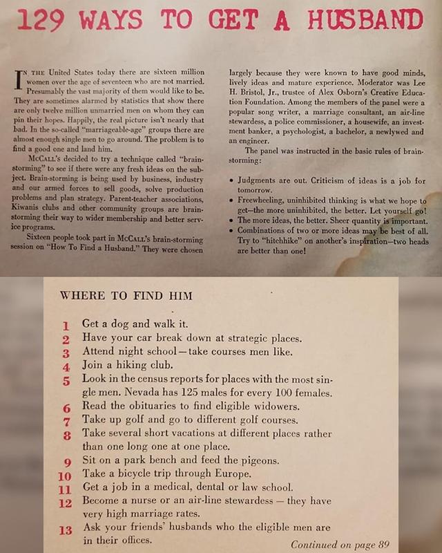There are some magazines today known for publishing controversial information, while some prefer to stick to fiction. In a perfect mix of controversy and fiction, the author of this article has taken it upon themselves to teach women the 129 ways to get a husband. The article even went as far as breaking down those ways into where to find him and how to get him and keep him. The more hilarious (we actually mean ridiculous) ones included buying a convertible because men love riding in them, reading the obituaries to know where to find eligible bachelors and ordering your steak on the rare side.