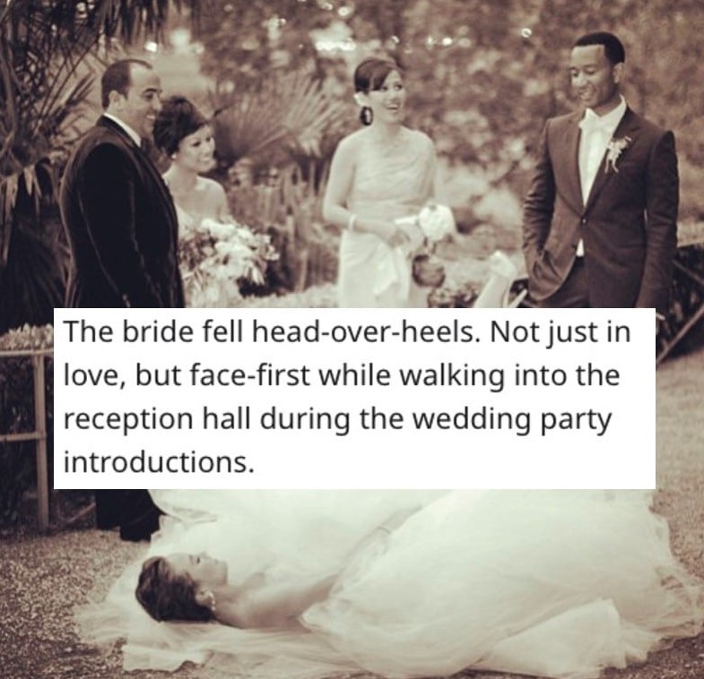 Many people have this fear: falling down in front of other people. Generally, it gets worse the larger the event is, such as weddings and graduations. This poor bride lived through her worst fear: she fell down in the reception hall in front of all her guests.