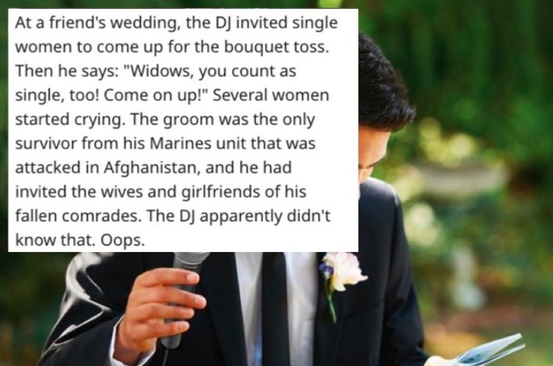 This DJ put his foot in his mouth when he told the audience at the wedding that widows also count as “single ladies.” His comment ended up offending almost everyone at the wedding, and a few of the widows in attendance burst into tears at his insensitive comment.