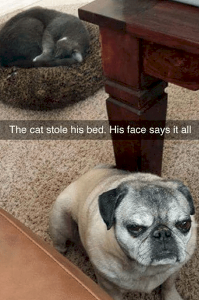 You can’t miss the look of jealousy on that face, can you? Well, the doggy sibling has all the reasons to be mad because it’s another case of bed-stealing that’s happening to him. Can’t these cats stay on their beds, human? At least help this little guy regain his personal space. Cats just do not know where their place is.