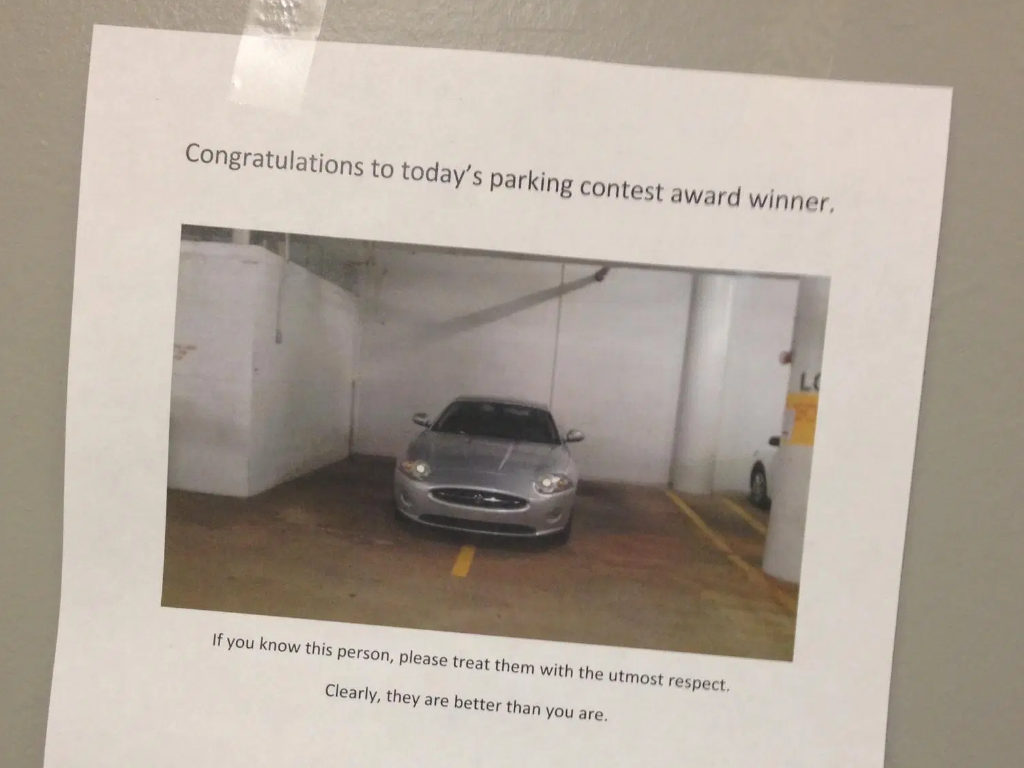 “Congratulations to today’s parking contest award winner. If you know this person, please treat them with the utmost respect. Clearly, they are better than you are.” A nice sign to explain why someone parked over two spaces.
