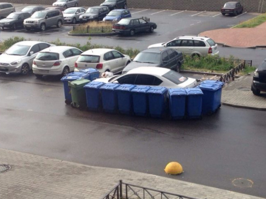 Similar to the Dumpster Defence, the Garbage Semicircle helpfully protects a car from harm by encasing it in garbage recepticles. If your parking is garbage, your car might as wel be where it belongs.