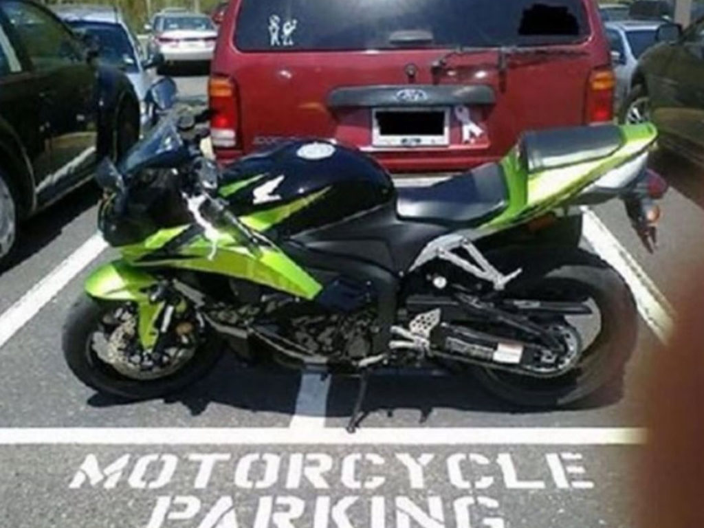 Bear in mind: if you park your car in the motorcycle parking area, you have nobody to blame but yourself if your exit is then blocked by a motorbike. The bike is in the correct place; your car is not.