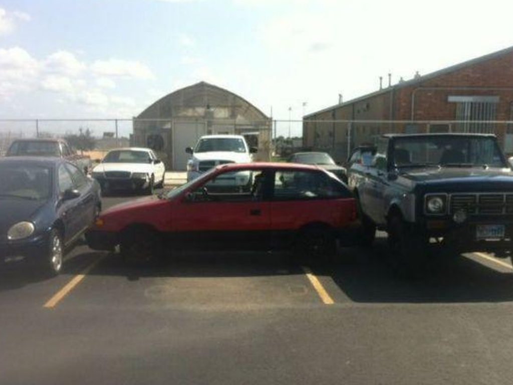Here’s another example of the Verticle Squeeze, in which a driver parks the wrong way across several spaces and has nobody else to blame when they get stuck with no room by a pair of cars that are legitimately parked the correct way.