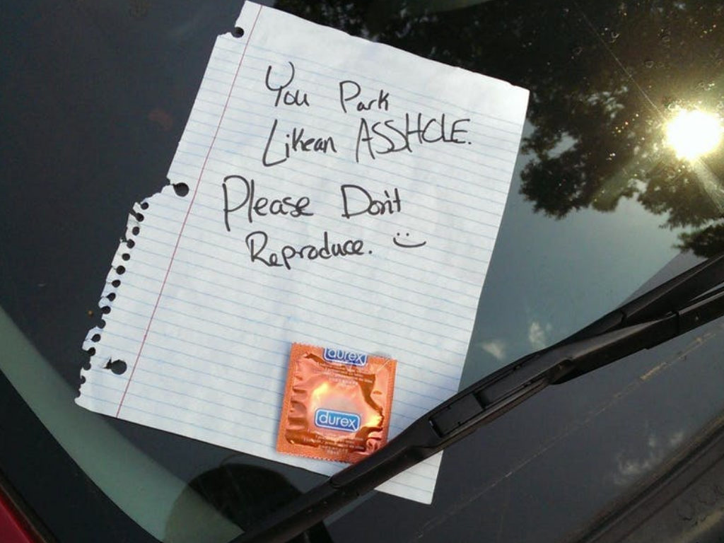 This one’s kind of nice: a friendly note (it mist be friendly, someone’s drawn a smiley face on it) recommending that the driver doesn’t reproduce. You could take offense at this, or you could enjoy your new free condom.