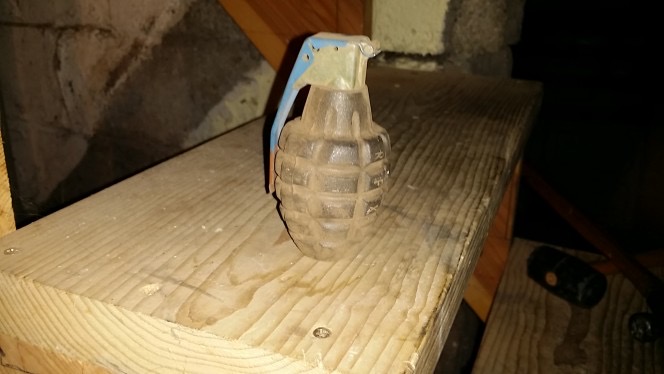 “No way!” Alex yells out. He moves aside a bag of ammunition and finds a grenade! Alex jumps back and lets out a sigh. What was this doing here? Why did the previous owner have it? He picks up the grenade and discovered that someone had drilled a hole in the bottom of the grenade and removed the gun powder. But Alex still had questions.
