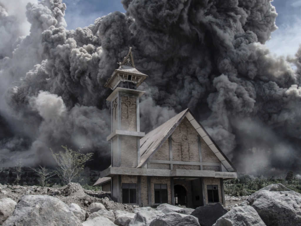 The area surrounding the Mount Sinabung volcano in Karo, Indonesia, became too dangerous for people to live in. So, many of the man-made structures in the area, like this church, were abandoned. This was particularly necessary in June 2015, when an eruption blanketed the sky and surrounding area with ash and smoke.