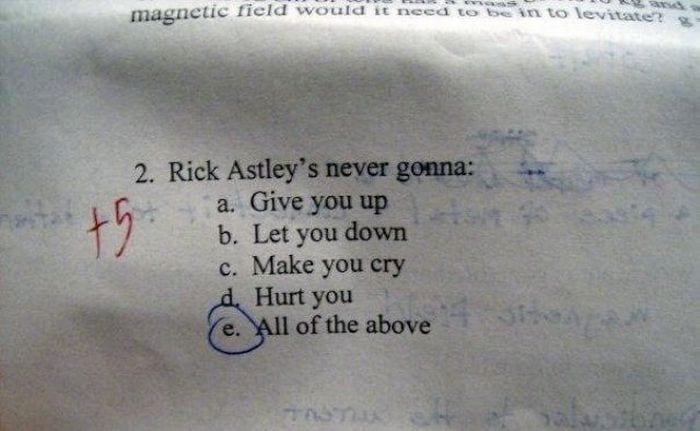This Kid’s Test Answer Was So Wrong But Also BrilliantBy Thomas Daily / November 27, 2020 The Teacher Rick Rolled The Class Credits How does that make you feel? We hope that every kid got it right. Pages: 1 2 3 4 5 6 7 8 9 10 11 12 13 14 15 16 17 18 19 20 21 22 23 24 25 26 27 28 29 30 31 32 33 34 35 36 37 38 39 40 41 42 43 44 45 46 47 48 49 50 51 52 53 54 55 56 57 58 59 60 61 62 63 64 65 66 67 68 69 70 71 72 73 74 75 76 77 78 79 80 81 82 83 84 85 86 87 88 89 90 91 92