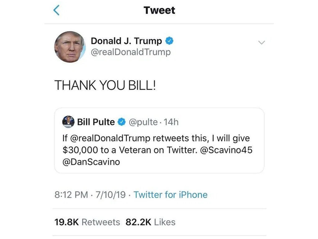 Two hours later, President Trump retweeted Pulte’s tweet and wrote: “Thank you Bill, say hello to our GREAT VETERANS!” But was Pulte surprised by the president’s quick retweet or his response? Not at all. And there’s a reason for that.