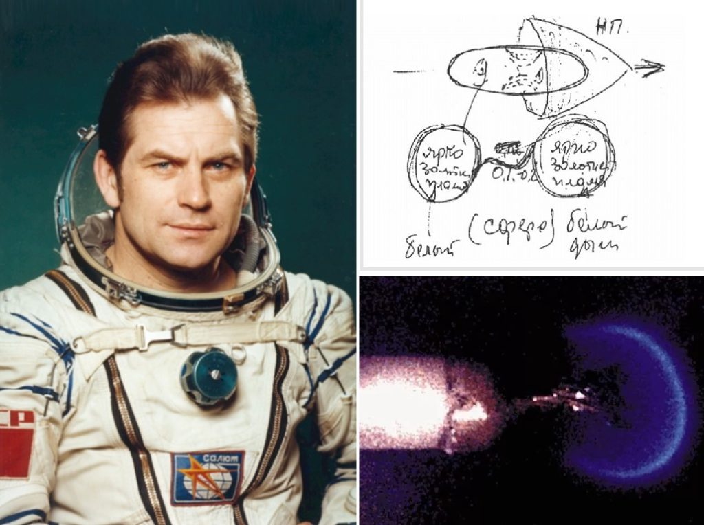 Maj. Gen. Vladimir Kovalyonok was on the Salyut VI space station in 1981 and saw something strange in a porthole: “The object was the size of a finger. I was surprised to see it was an orbiting object. […] Savinykh prepared to take a picture of it, but the UFO suddenly exploded. Only clouds of smoke were left. The object split into two interconnected pieces. It was reminiscent of a dumbbell. I reported about it to the Mission Control immediately.”