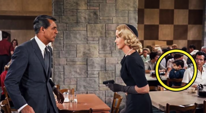 In one of the most dramatic scenes, Eve Kendall’s character unexpectedly shoots Thornhill in a café. Obviously, they had us on the edge of our seats, so I doubt anyone realized this tiny detail in the background. Among the crowd, there’s a young boy dressed in blue who is covering his ears, obviously knowing that the sound of shots was about to come. I guess that not even the editors took notice.
