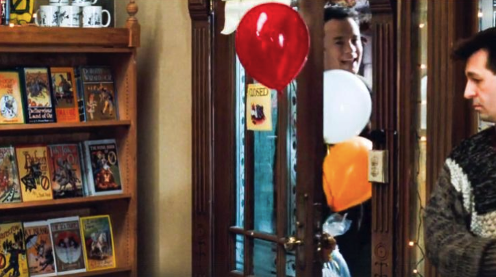 Remember when Joe (played by Tom Hanks) leaves the bookshop carrying a bunch of balloons in one hand and a goldfish on the other? The balloons get stuck in the door, and we hear Hanks say “It’s great it wasn’t the fish!”. Funnily enough, this line was totally improvised, as the balloons weren’t actually meant to get stuck in the door!