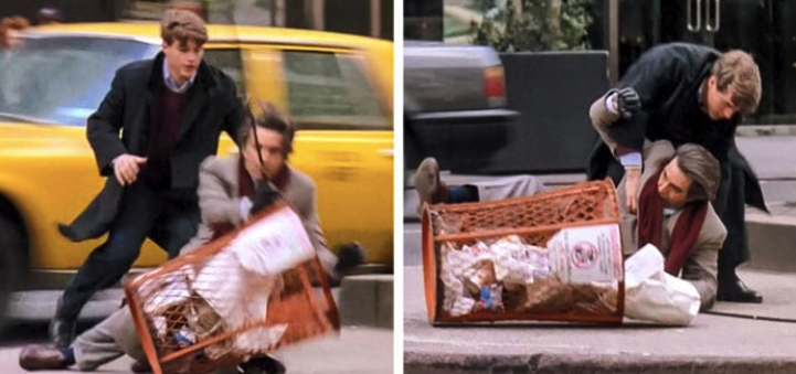 In an interview with Larry King, Al Pacino told him that to play blind, “you don’t focus your eyes. And what happens is, you just go into a state”. This is the case in the scene where he falls over a garbage can. It was not scripted, it happened out of sheer bad luck, but it was kept in the final take.