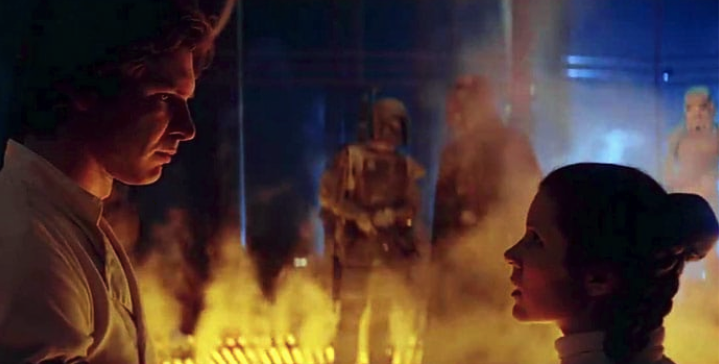 Described by George Lucas as “a cynical loner who realizes the importance of being part of a group and helping for the common good“, the captain of the Millenium Falcon, Han Solo (portrayed by Harrison Ford) is frozen in carbonite by Darth Vader. Previous to that scene, Princess Leia (portrayed by Carrie Fisher) finally confesses her feelings for the rogue, telling him: “I love you“. The original response in the script for Ford was “I love you, too,” but George Lucas told Ford to just say what he thought was best and “I know*” was the result, fitting in with his character’s persona perfectly.