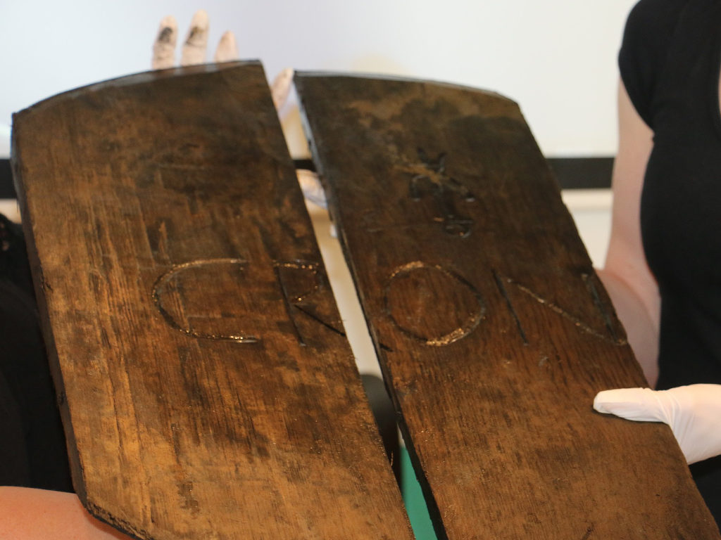 This sign, which shows the name of the ship, lay undisturbed at the bottom of the sea for centuries. Now, all cleaned up, we can see what the wood of the Kronan (or, it seems, Cronan) actually looked like when it first set sail.