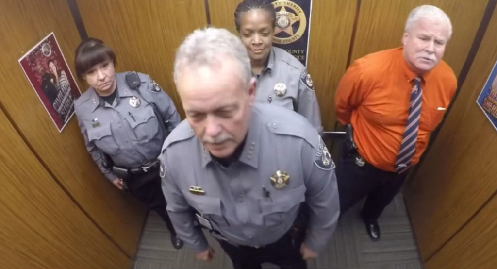 The Sheriff is in town, and the three officers decide to put their fun on pause. Once Sheriff Bill Elder enters the elevator, all three dancing officers stop in their tracks. It seems like the party may be just about over, but this elevator ride takes yet another turn. The Sheriff is one to be taken seriously, and Elder obviously knows when it is time to get down to business. He definitely does just that!