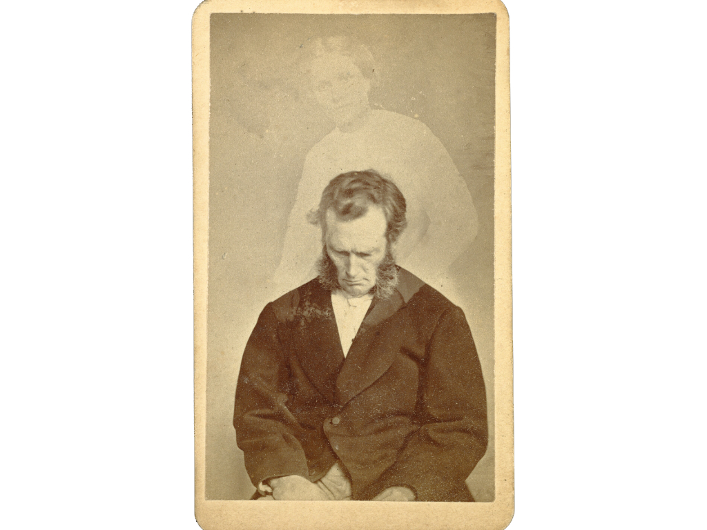 This photo appears to show a forlorn man with sideburns, looking down, while… is that a ghost? Is there a ghost behind him? No, this is, of course, another example of trick photography from this era. That woman was very much alive at the time that this picture was taken, she simply hopped out of frame part way through the exposure of the photograph so that she left nothing more than a ghostly outline.
