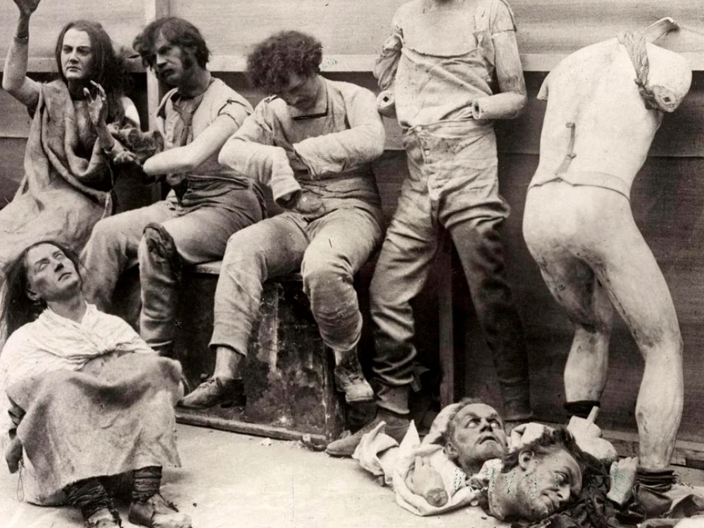 This photo is a behind-the-scenes picture from the Madame Tussauds waxwork museum in London. To this day, the museum is a popular attraction, showing off a variety of modern and historical celebrities. While the exact date of this photo is unknown, some attribute it to around 1925, when the museum burned to the ground, leaving a lot of half-melted statues behind.