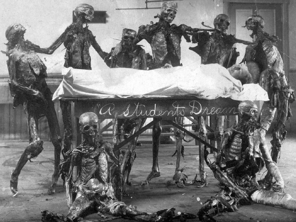 A very common type of posed photo to take was a Student’s Dream, in which medical students were being dissected by their cadavers, rather than the other way around.